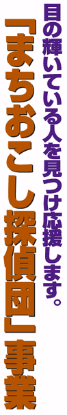 活躍中のまちおこし探偵団地域や業界の中で、意欲ある人々に地域づくりや業界振興に活躍してもらおうと、商工会議所では平成5年からまちおこし探偵団事業を展開しています。現在10団体が意欲的な事業を行っています。あなたも探偵団を組織して地域おこしや業界振興にチャレンジしてみませんか。