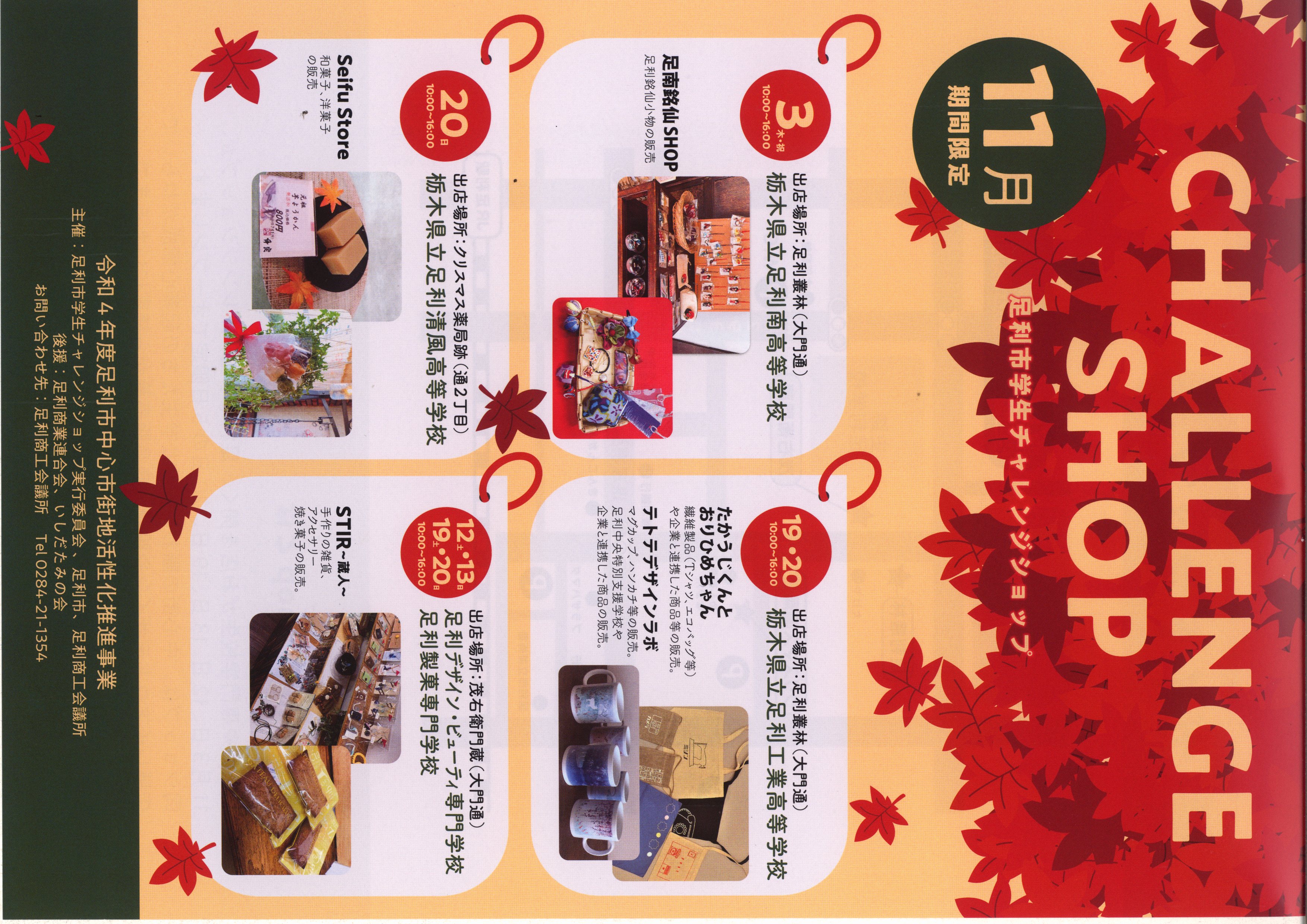 足利市学生チャレンジショップが期間限定で開催されることとなりました。現役の高校生が皆様をおもてなし致しますので、ぜひ足をお運びください。お待ちしております!!