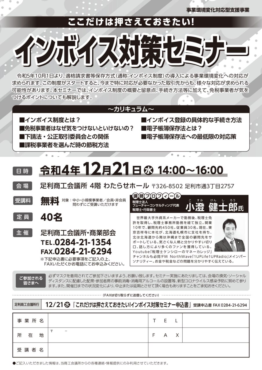 足利商工会議所では、適格請求書等保存方式(通称:インボイス制度)の導入に向けて「インボイス対策セミナー」を開催いたします。
