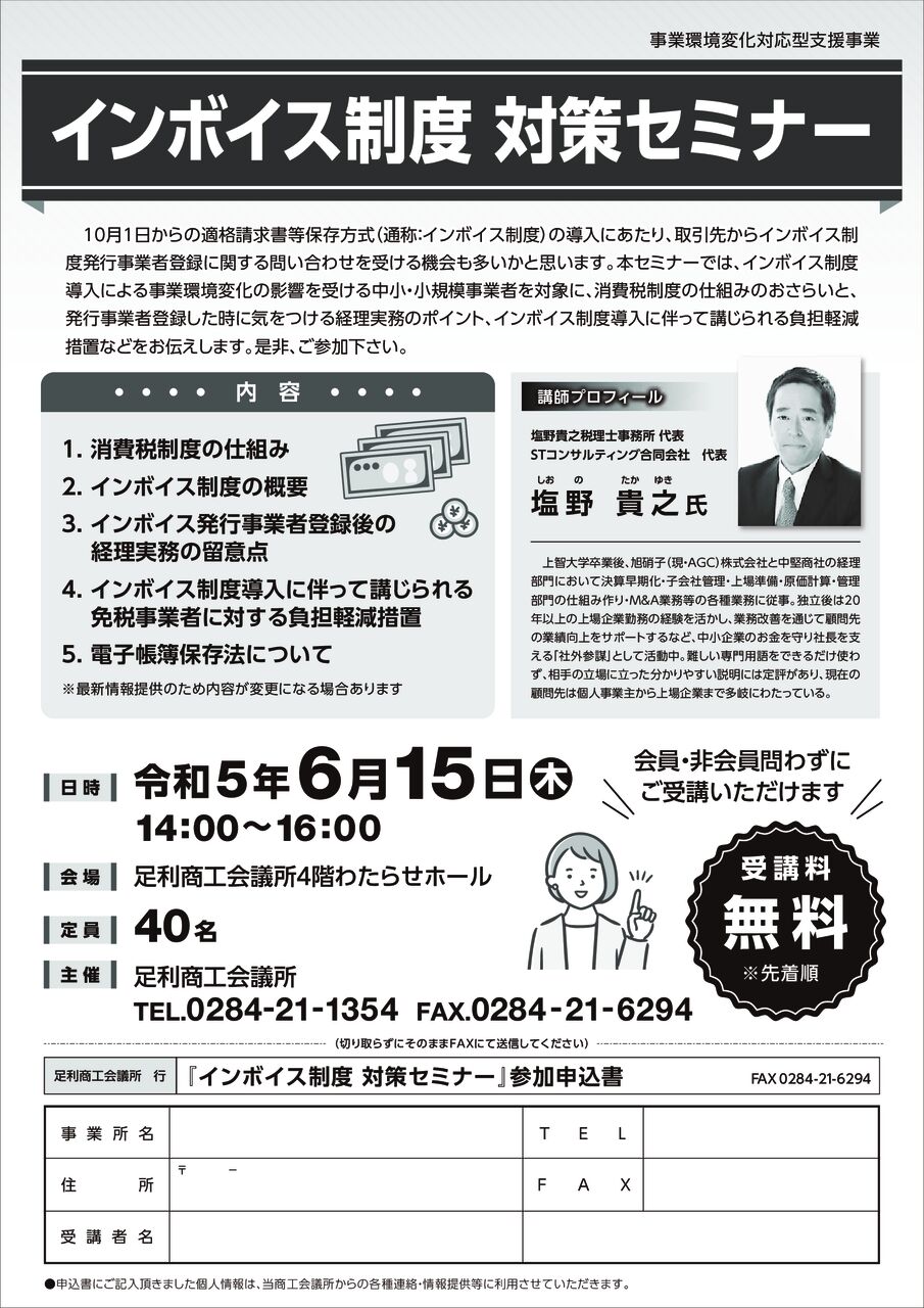 足利商工会議所では、令和5年10月に導入される適格請求書等保存方式(通称:インボイス制度)についてのセミナーを開催します。