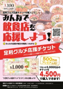 2020年5月7日 / 最終更新日時 : 2022年11月12日 webmaster INFORMATION 足利グルメ応援チケット 参加店募集 足利グルメ応援チケット実行委員会では、参加店を募集しております。 「足利グルメ応援チケット」とは、新型コロナウイルス感染防止対策の外出自粛要請で客足が減少している市内の飲食店を応援する目的で販売する飲食代金の先払いチケットです。 参加店募集受付は、5月7日(木)から7月31日(金)までです。応援チケットを販売し、当面の資金繰り等の改善に少しでもお役立てください。募集要項などの詳細は、足利グルメ応援チケットのホームページでご確認ください。 足利グルメ応援チケットのホームページ