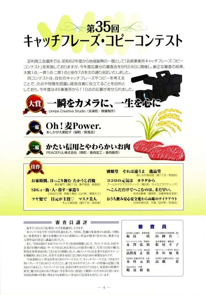 2021年10月20日 / 最終更新日時 : 2021年10月28日 商業課 INFORMATION 大賞に Unripe Creative Studio 【キャッチフレーズ・コピーコンテスト】 足利商工会議所では、「第35回キャッチフレーズ・コピーコンテスト」を実施し、大賞1点・一席1点・二席1点と、佳作7点の入賞作品が決定しました。 たくさんのご応募ありがとうございました。入賞された事業所の皆様おめでとうございます。 入賞作品は以下の通りです。