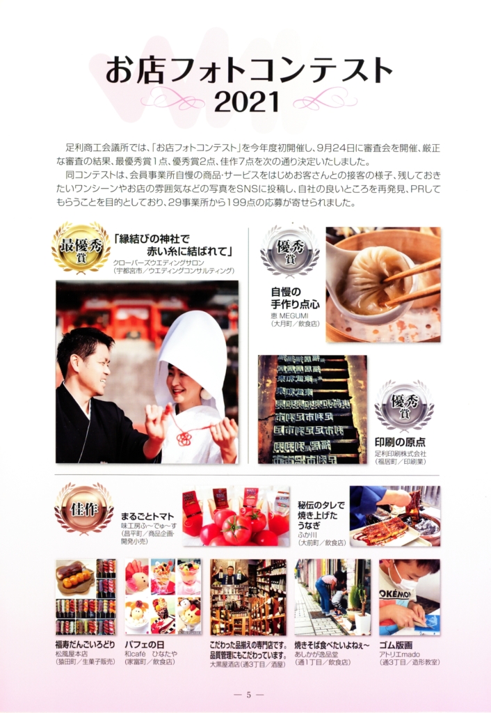 2021年10月20日 / 最終更新日時 : 2021年10月28日 商業課 INFORMATION 最優秀賞に クローバーズウエディングサロン 【お店フォトコンテスト2021】 足利商工会議所では、「お店フォトコンテスト2021」を実施し、最優秀賞1点・優秀賞2点と、佳作7点が決定しました。 たくさんのご応募ありがとうございました。入賞された事業所の皆様おめでとうございます。 入賞作品は以下の通りです。