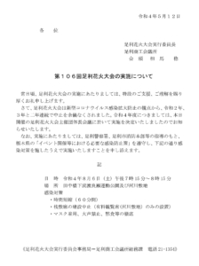 2022年5月12日 / 最終更新日時 : 2022年5月12日 webmaster INFORMATION 第106回足利花火大会開催決定! 第106回足利花火大会につきまして、下記の通り令和4年8月6日(土)の開催を 決定いたしました。 感染対策を施した上で、見ごたえのある花火大会を目指して準備を進めて参りますので、 ご理解、ご協力をお願いいたします。