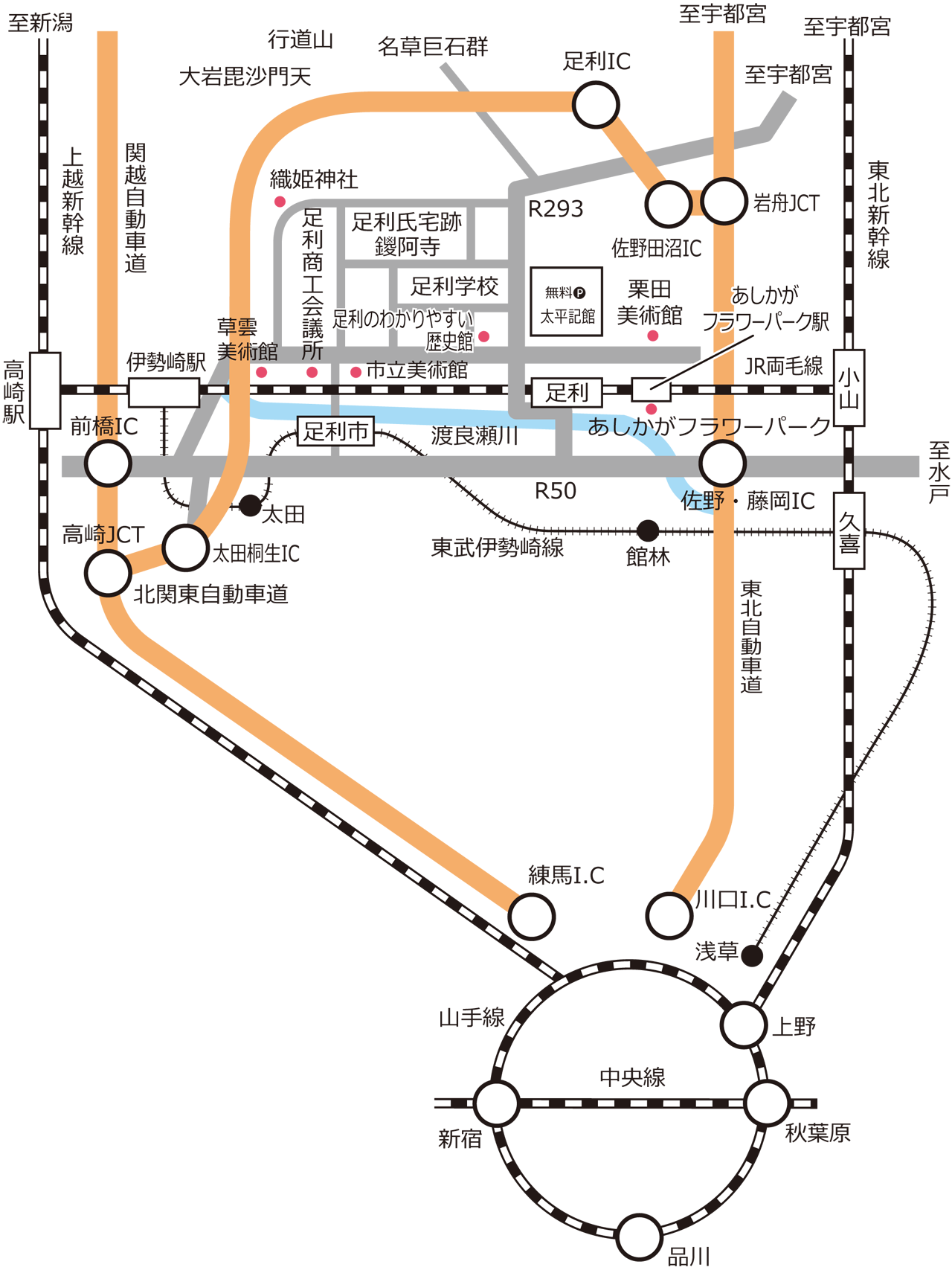 お車での交通アクセス ◎東北自動車道 佐野・藤岡I.Cより約30分 ◎北関東自動車道 足利I.Cより 中心街へ約10分